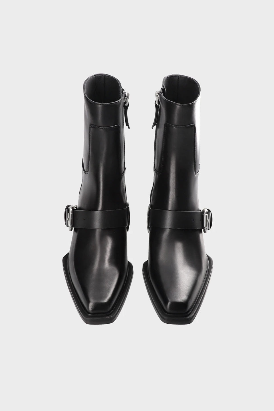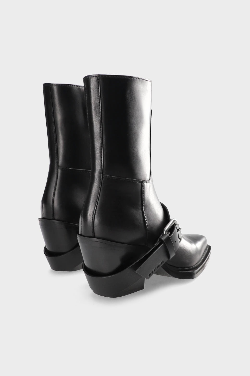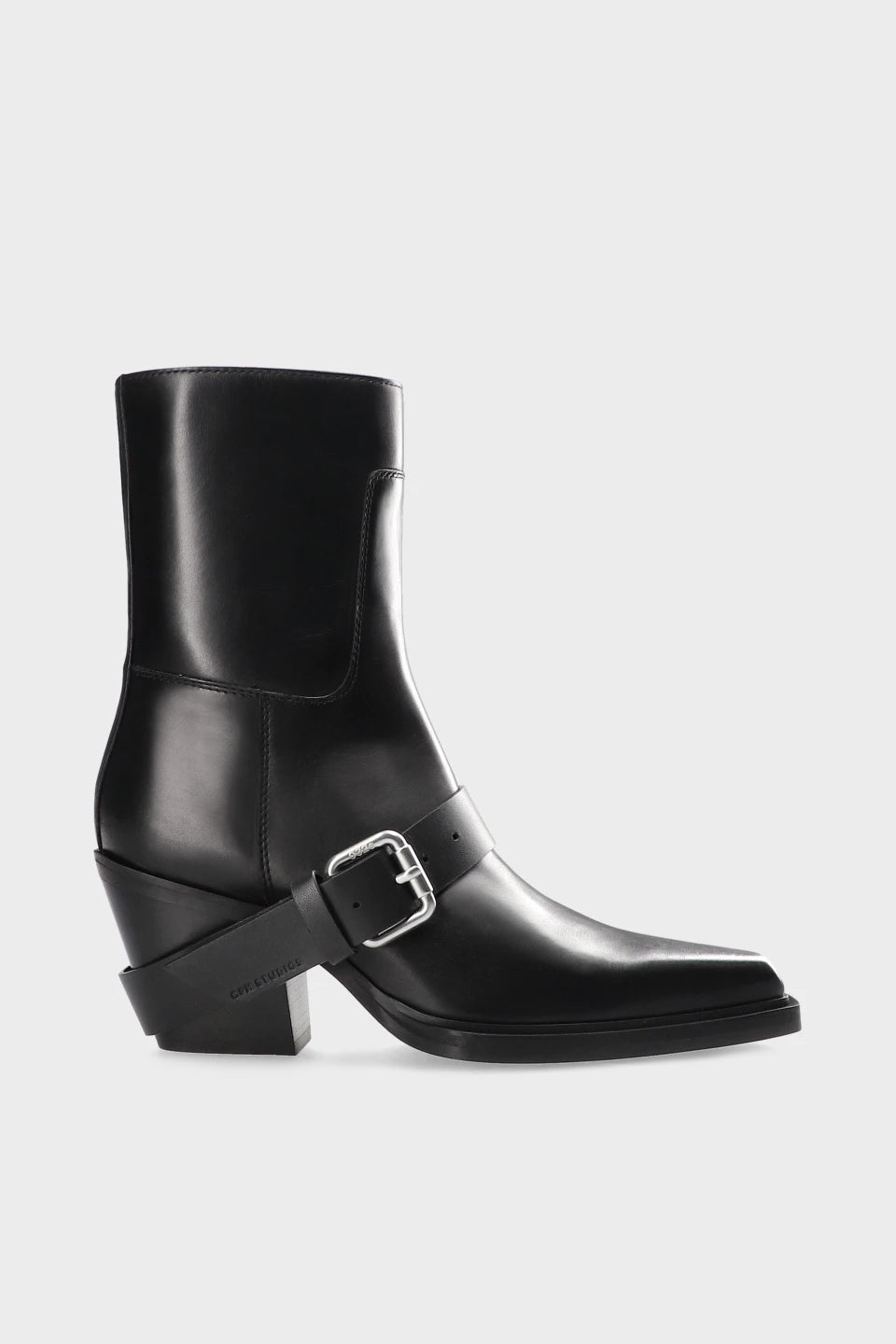 The 032c | COPENHAGEN STUDIOS ANKLE BOOTS with buckle are handcrafted in Italy from the finest smooth leather and adorned with biker-inspired metal accents. They feature an embossed 032c logo on the sole and a Copenhagen Studios logo on the leather strap.