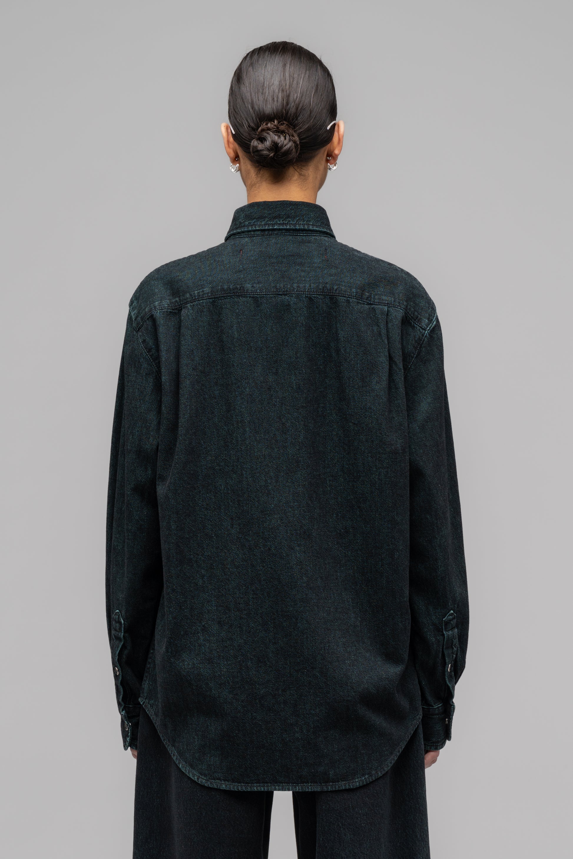 Regular cut denim shirt with a special overdyed moon wash treatment. Equipped with a Mother of Pearl snap-through front.