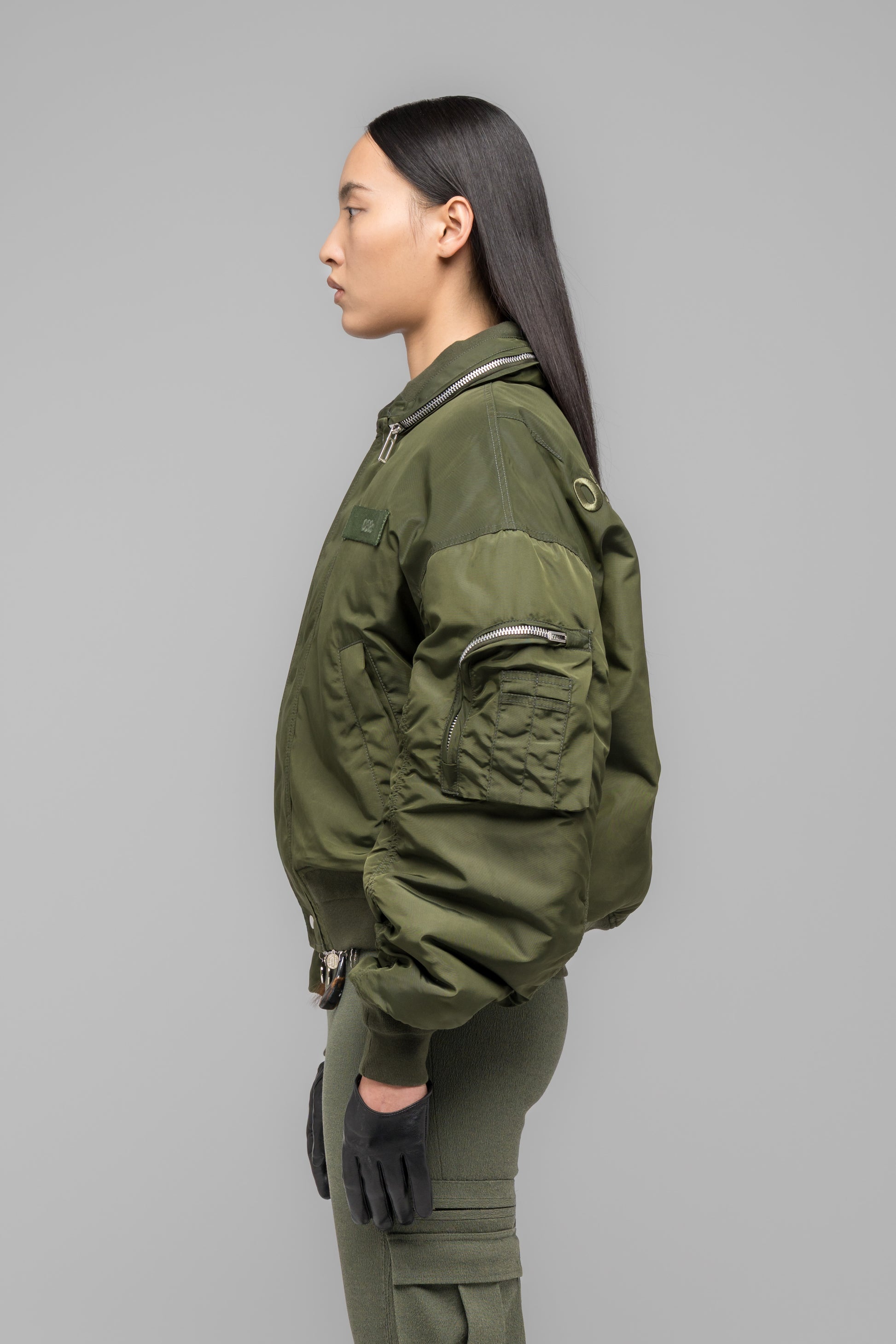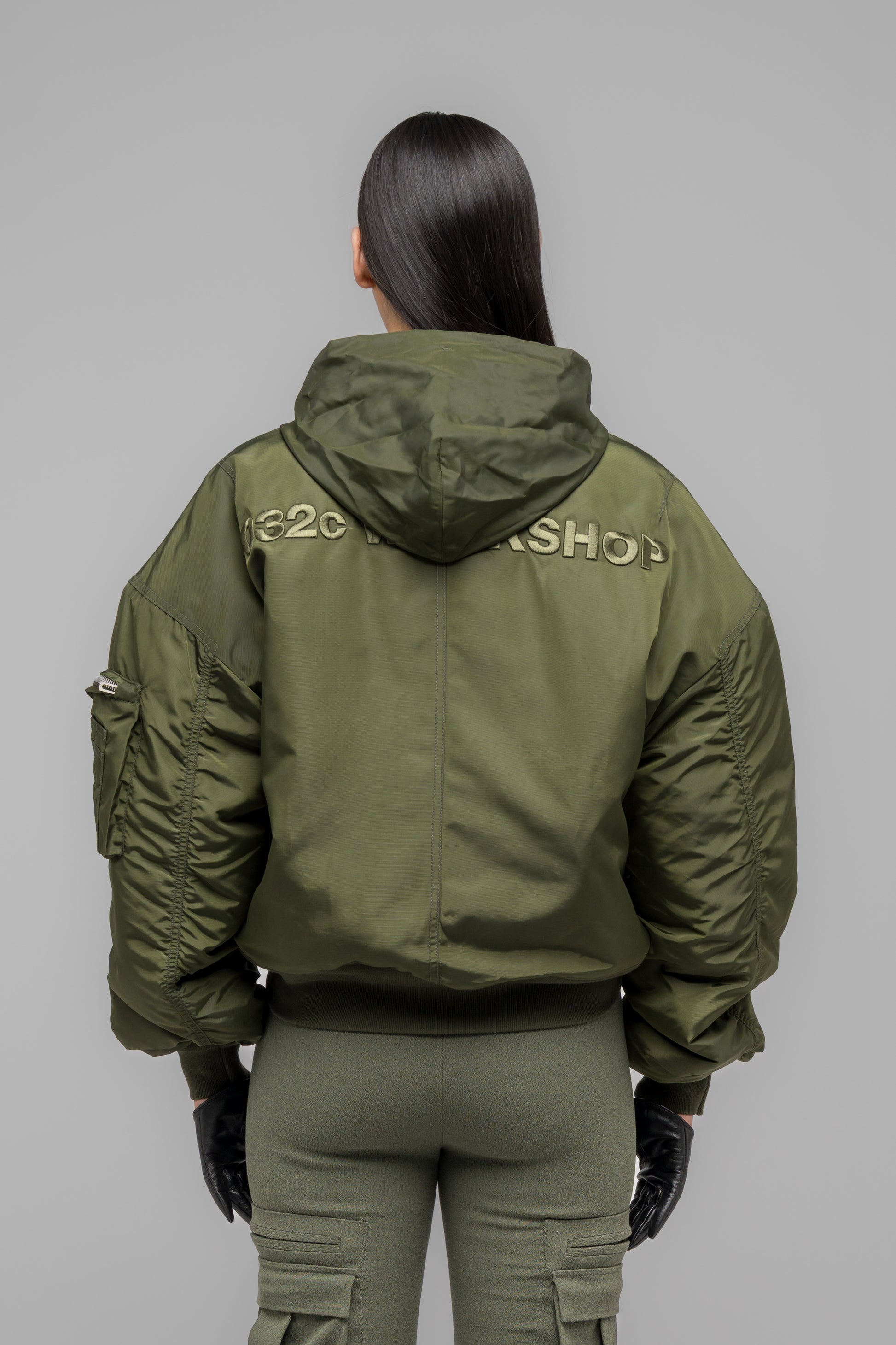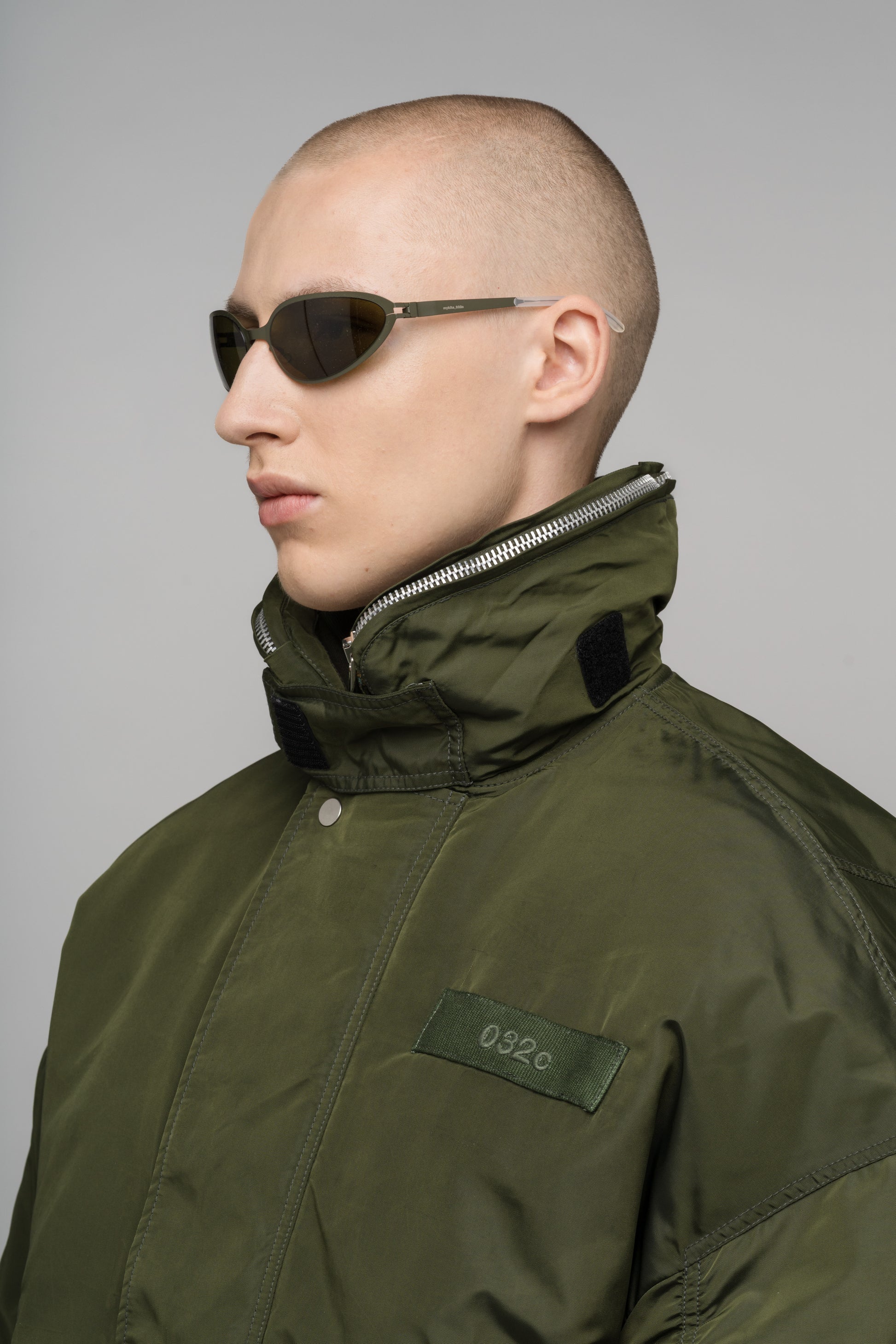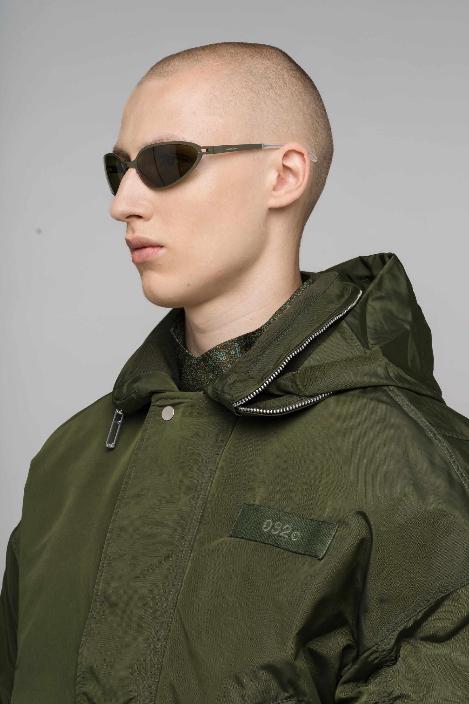 Relaxed-fit bomber jacket in heavy oxford fabric with a two-tone drop-dye effect and water-repellent finish. Features welt side pockets, sleeve patch pocket, multifunctional collar with hidden hood, ribbed cuffs with thumb holes, branded zip puller, and 3D embroidered 032c Workshop logo on the back.