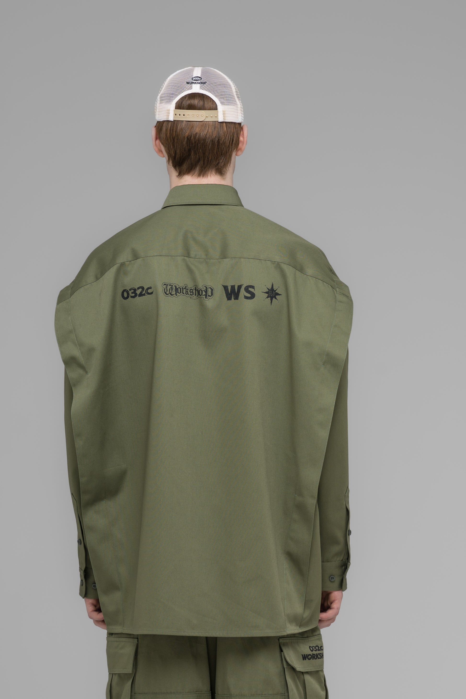 Cargo overshirt with four patch pockets on front, double-layer sleeves with raw edges, two-button sleeve adjusters, and shoulders constructed with a pleat. Equipped with an embroidered patch on the chest pocket and a seasonal artwork screenprint on the back.