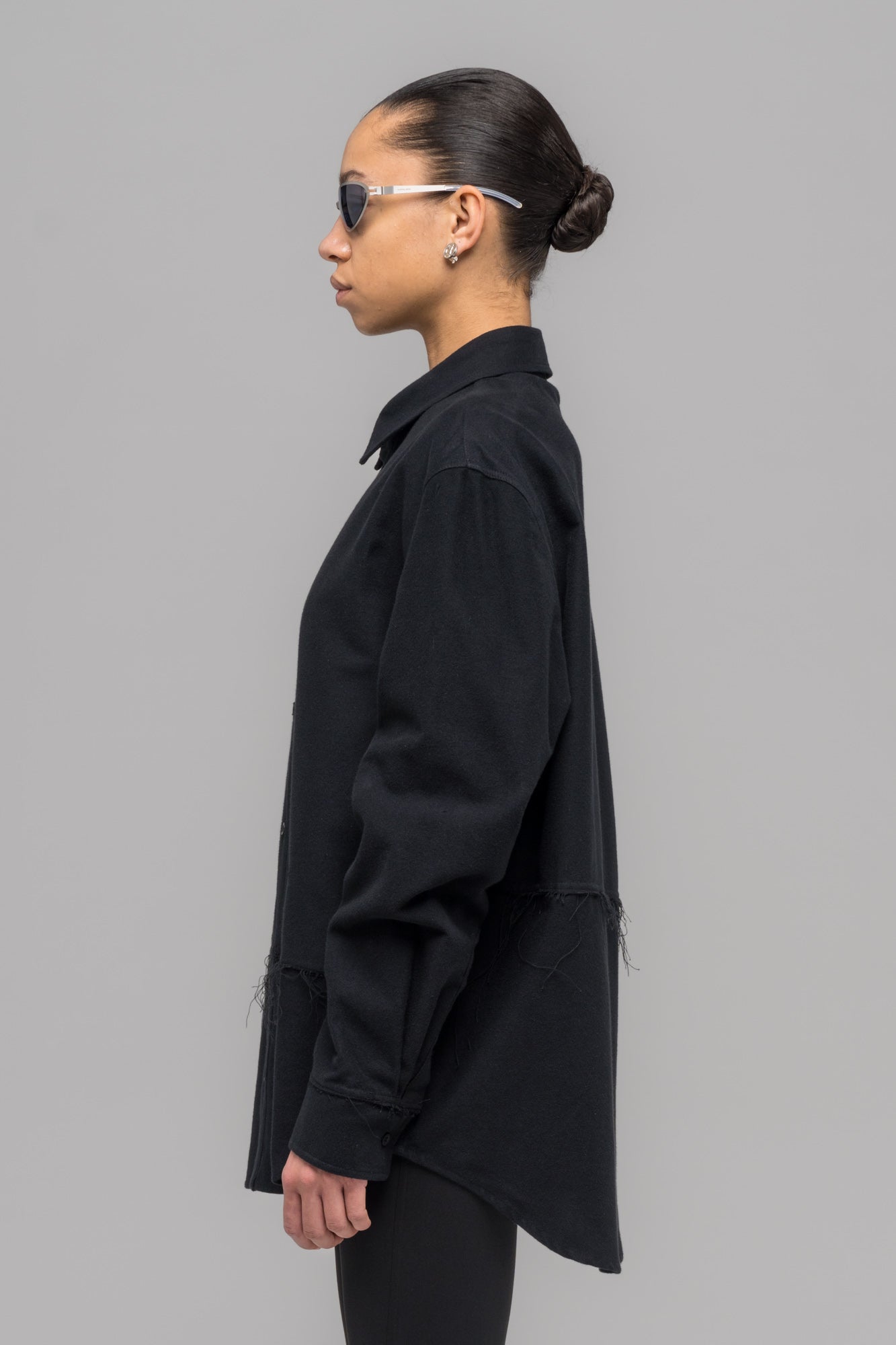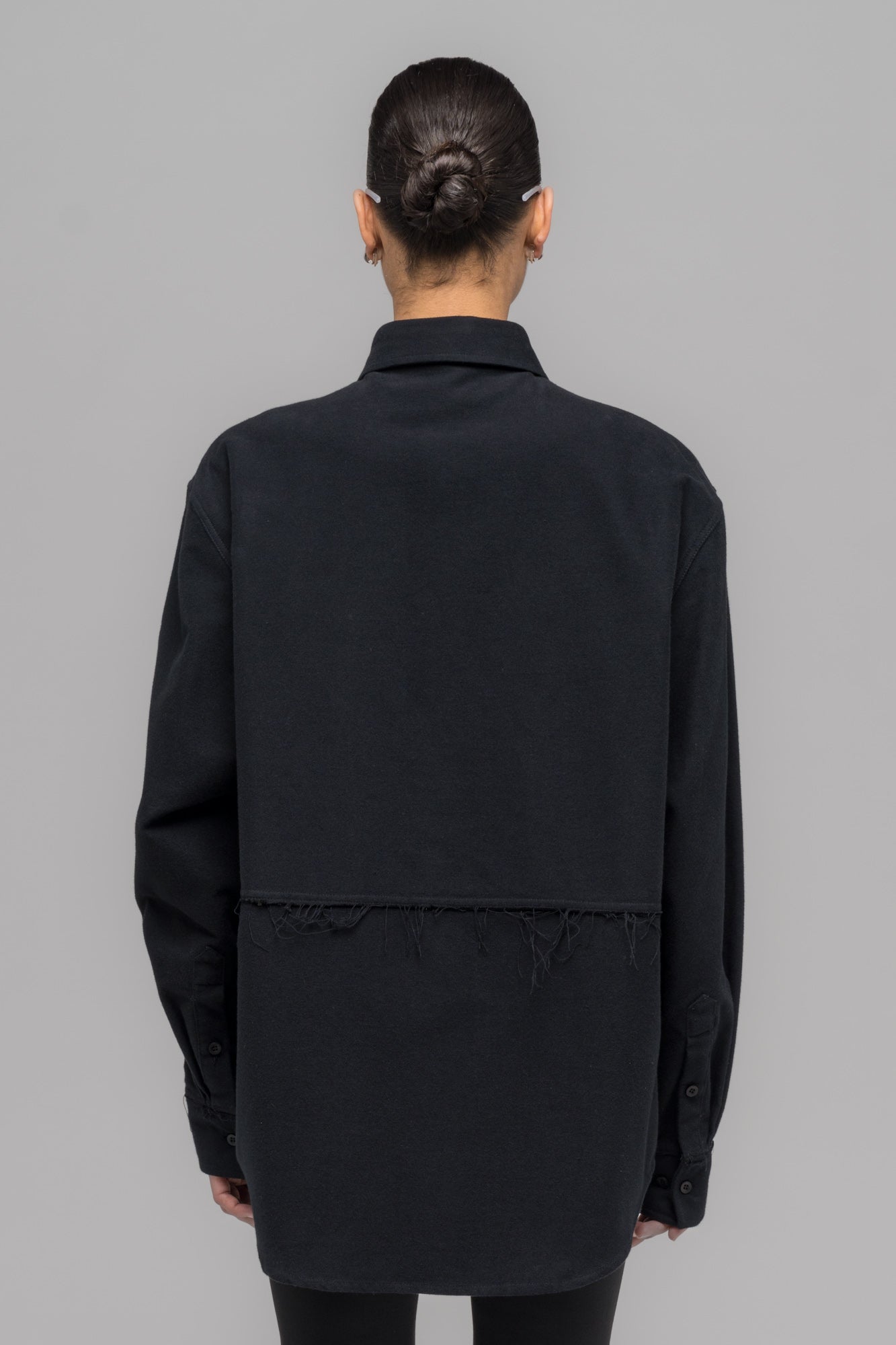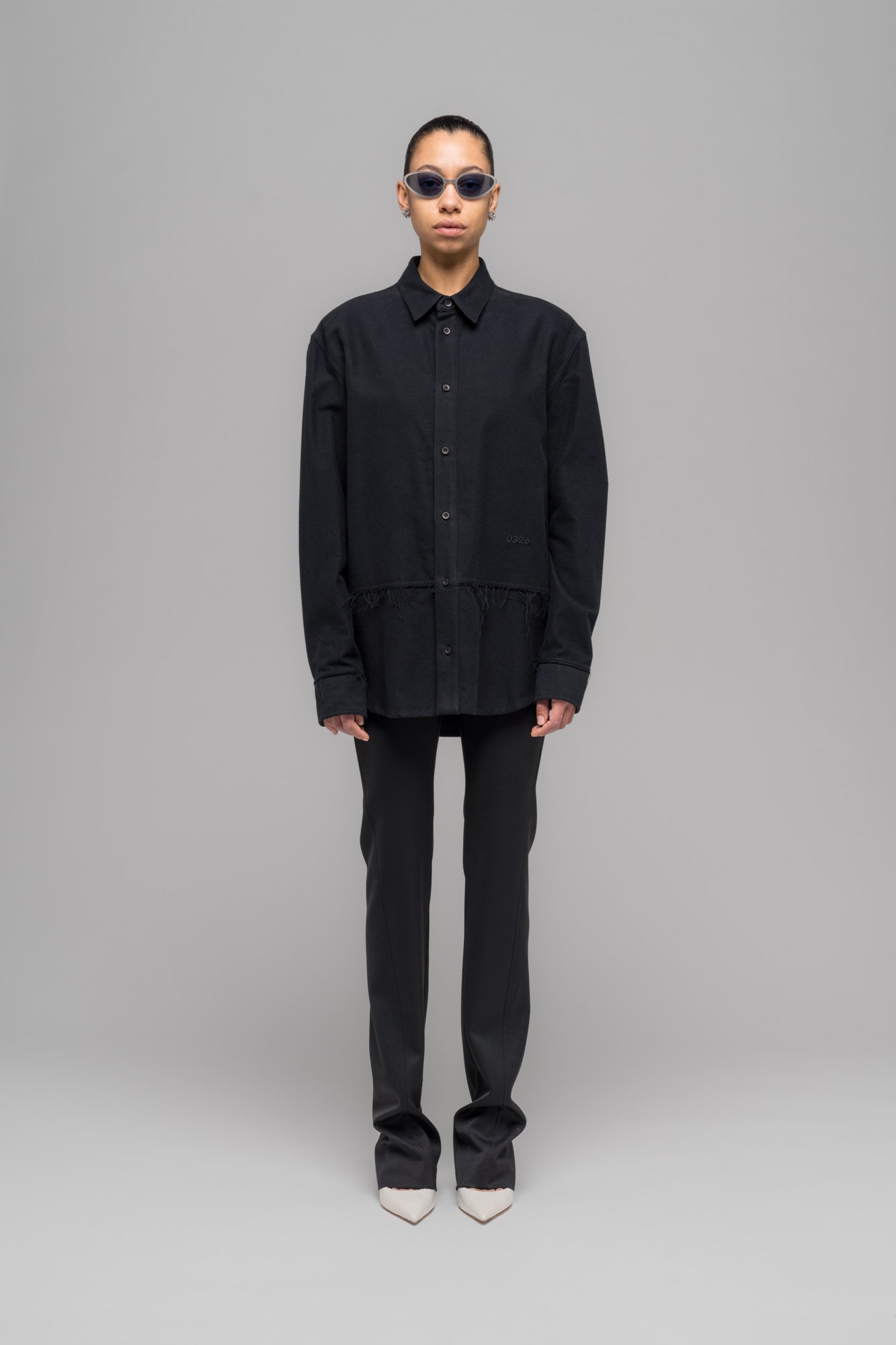 Flannel shirt with front button closure, patch details, and embroidered 032c logo.