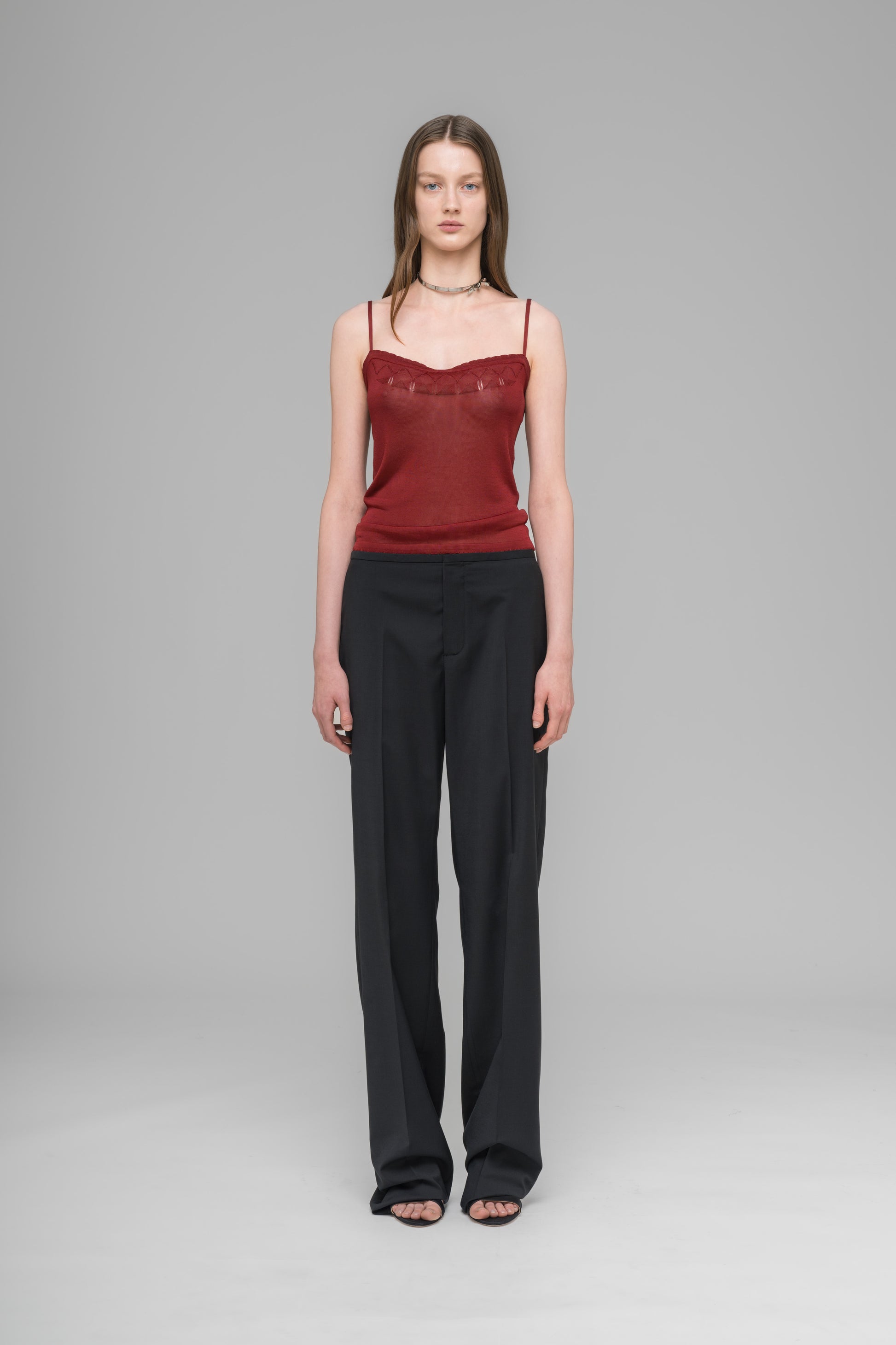 Low-rise, wide-leg trousers crafted from our breathable summer wool. Bound skinny waistband detailing. Single welt pocket at the back; side Italian pockets for ease use. 032c embroidered logo patch at back.