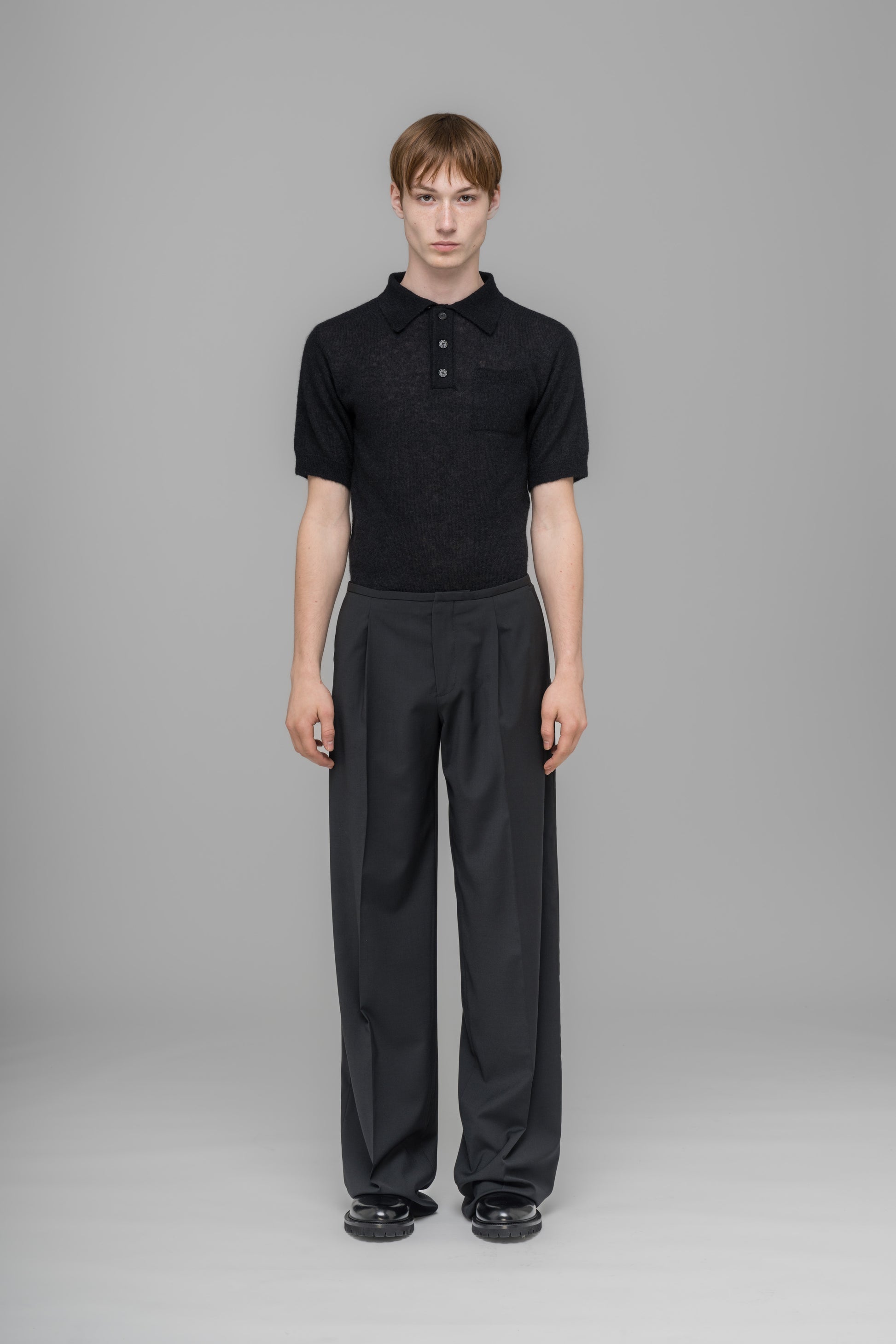 Wide-leg suit trousers crafted from our breathable summer wool. A single welt pocket, back darts, and press creases centred along the front and back leg create the perfect silhouette. Finished with a small embroidered patch of the 032c logo.