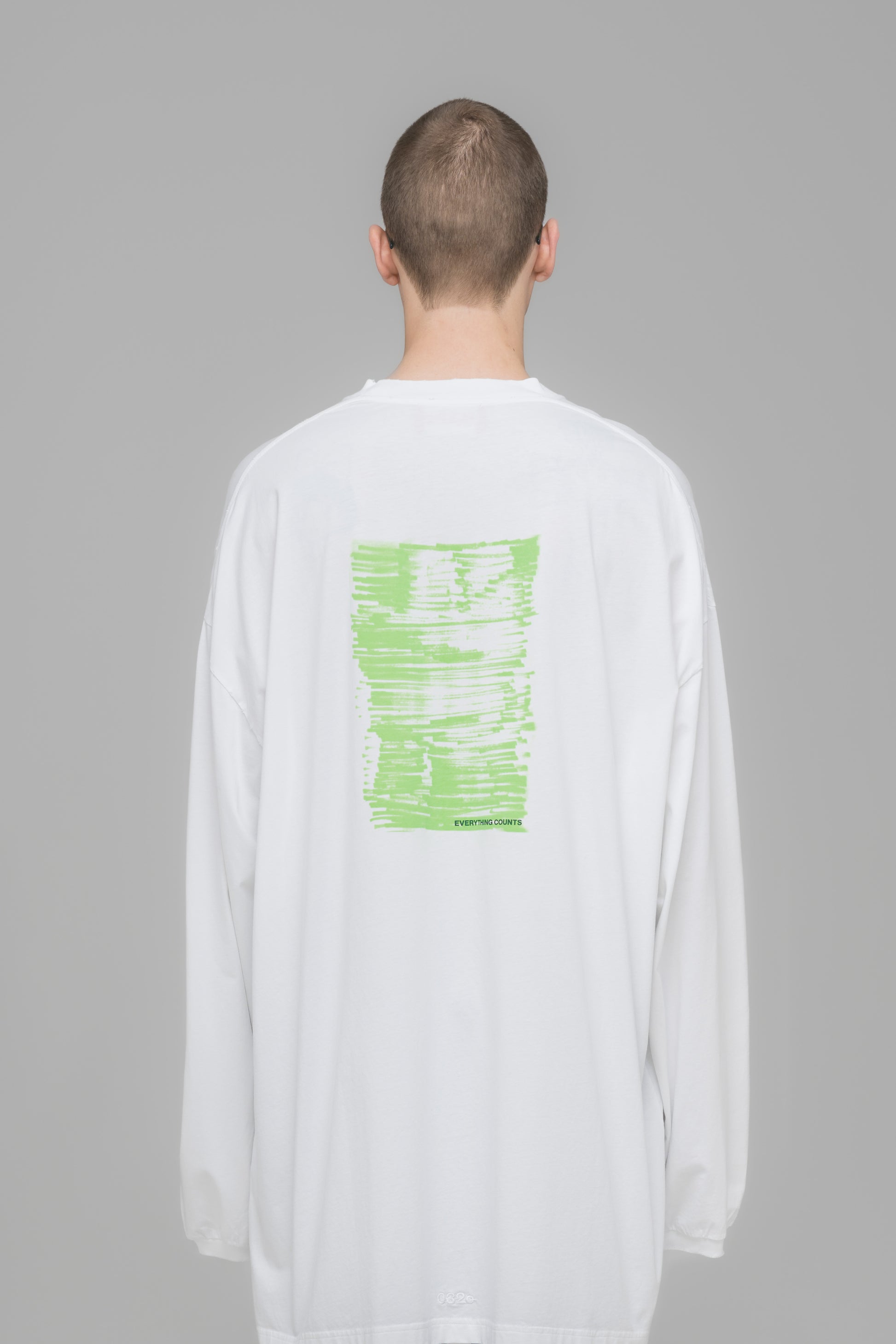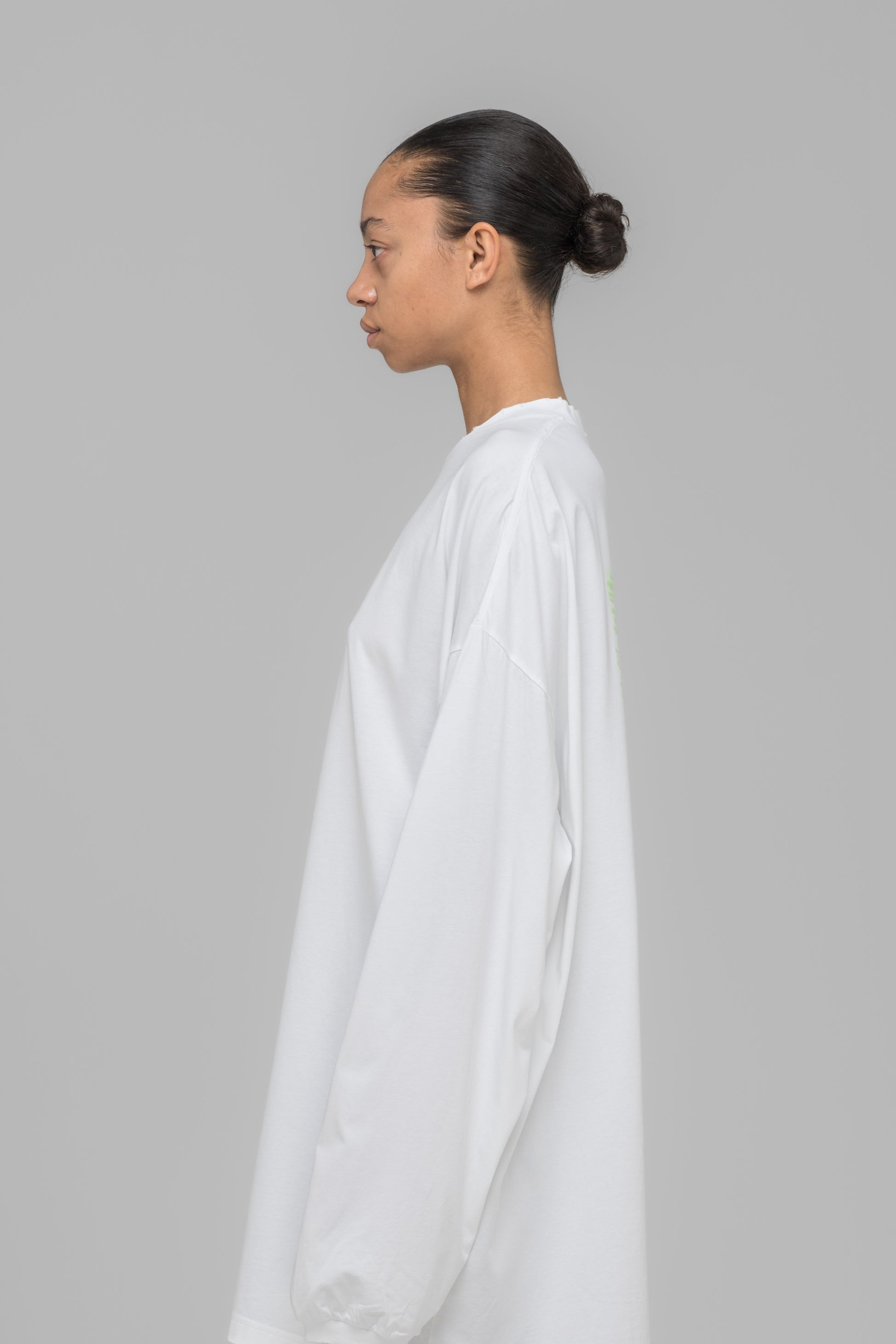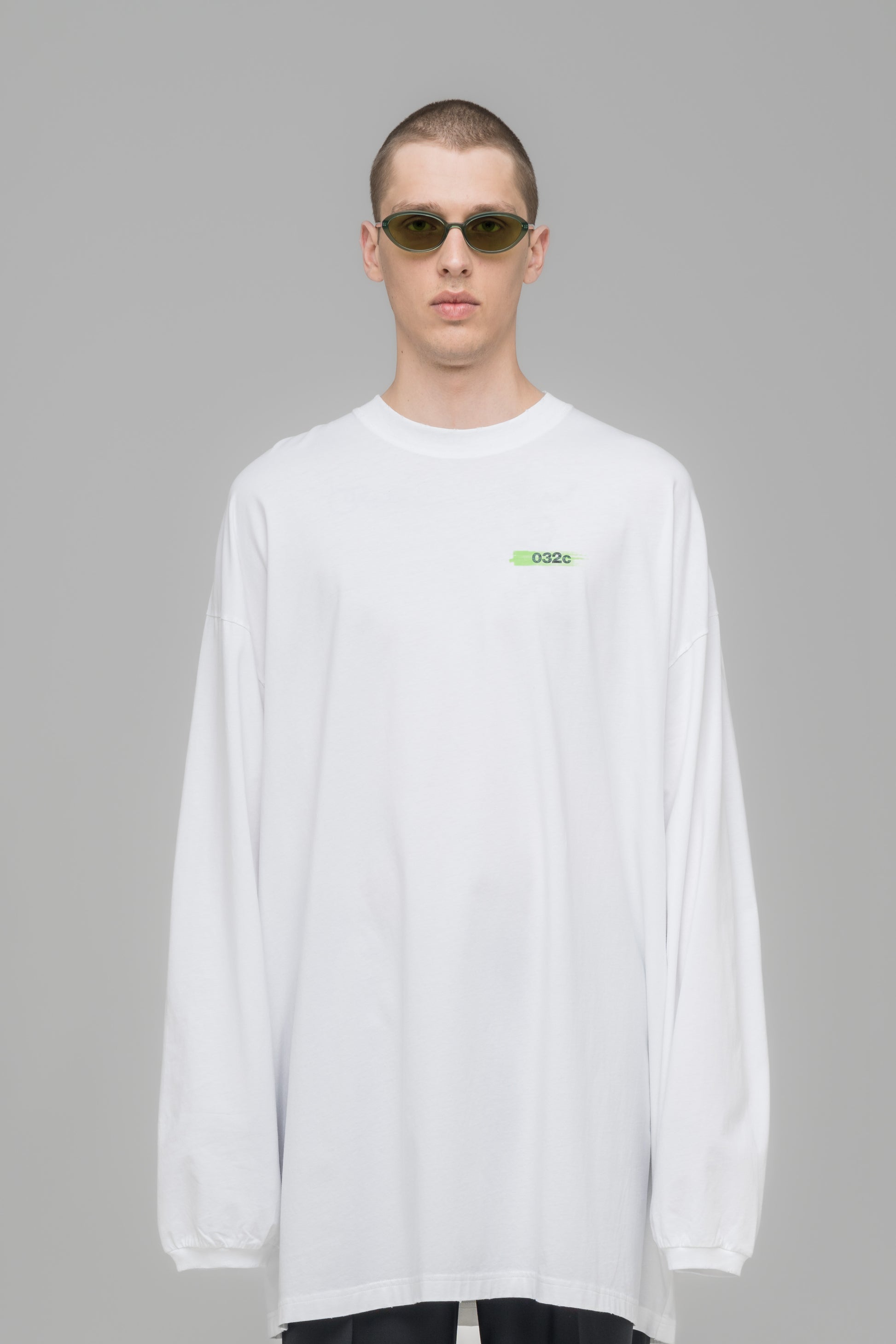 Our oversized longsleeve in white showcases distinct digital print 032c artwork. Distressed slightly for an overall vintage feel.