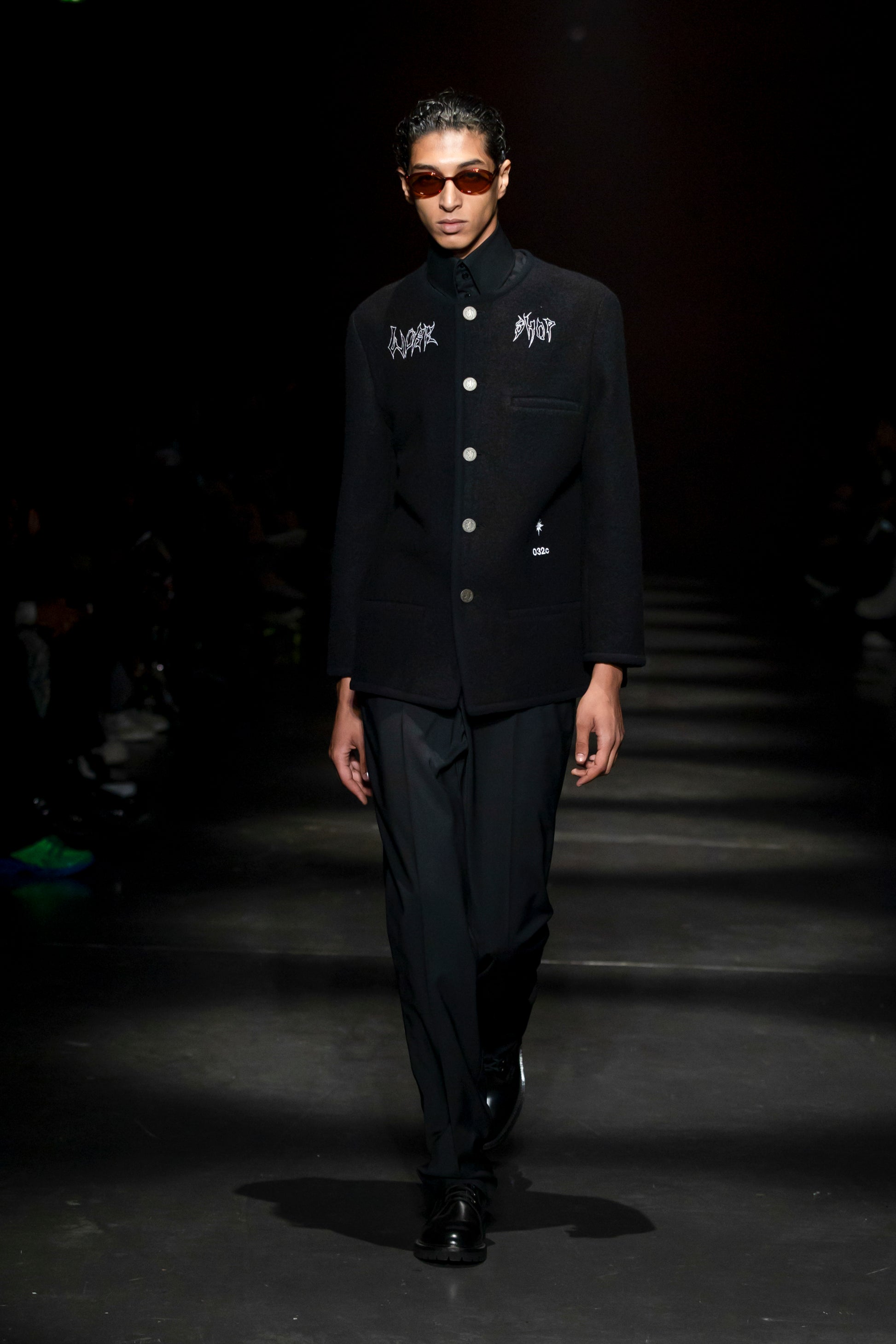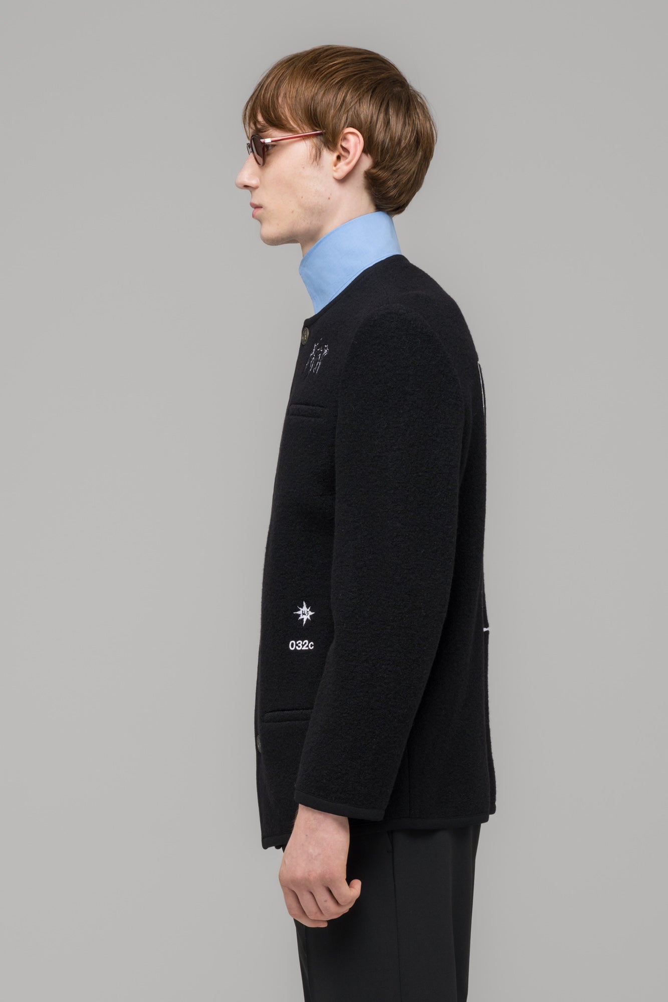 Constructed from boiled wool with bound edges and front welt pockets. The janker is equipped with metal-branded buttons, an embroidered 032c logo on the front, a workshop patch on the sleeve as well as additional fine line embroidered 032c artworks.