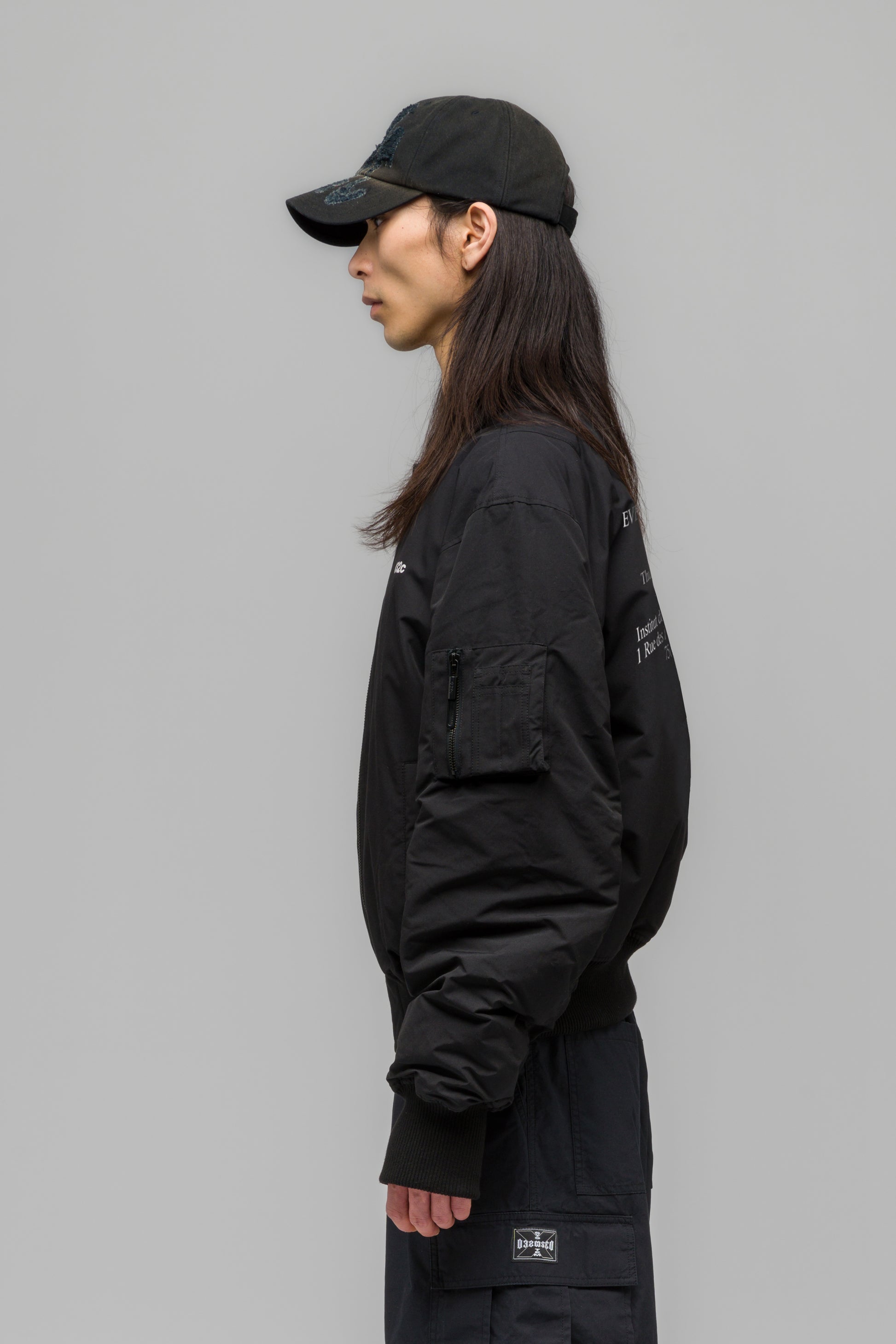 Our iconic relaxed-fit zip-through bomber jacket with welt pockets on the body and a patch pocket on the sleeve. Cotton ribbing at collar and cuffs. Padded and fully lined in fluid viscose lining. 032c metal machine zipper puller on sleeve pocket and a thumb hole on the sleeve rib to keep hands warm. A signature carry-over style.