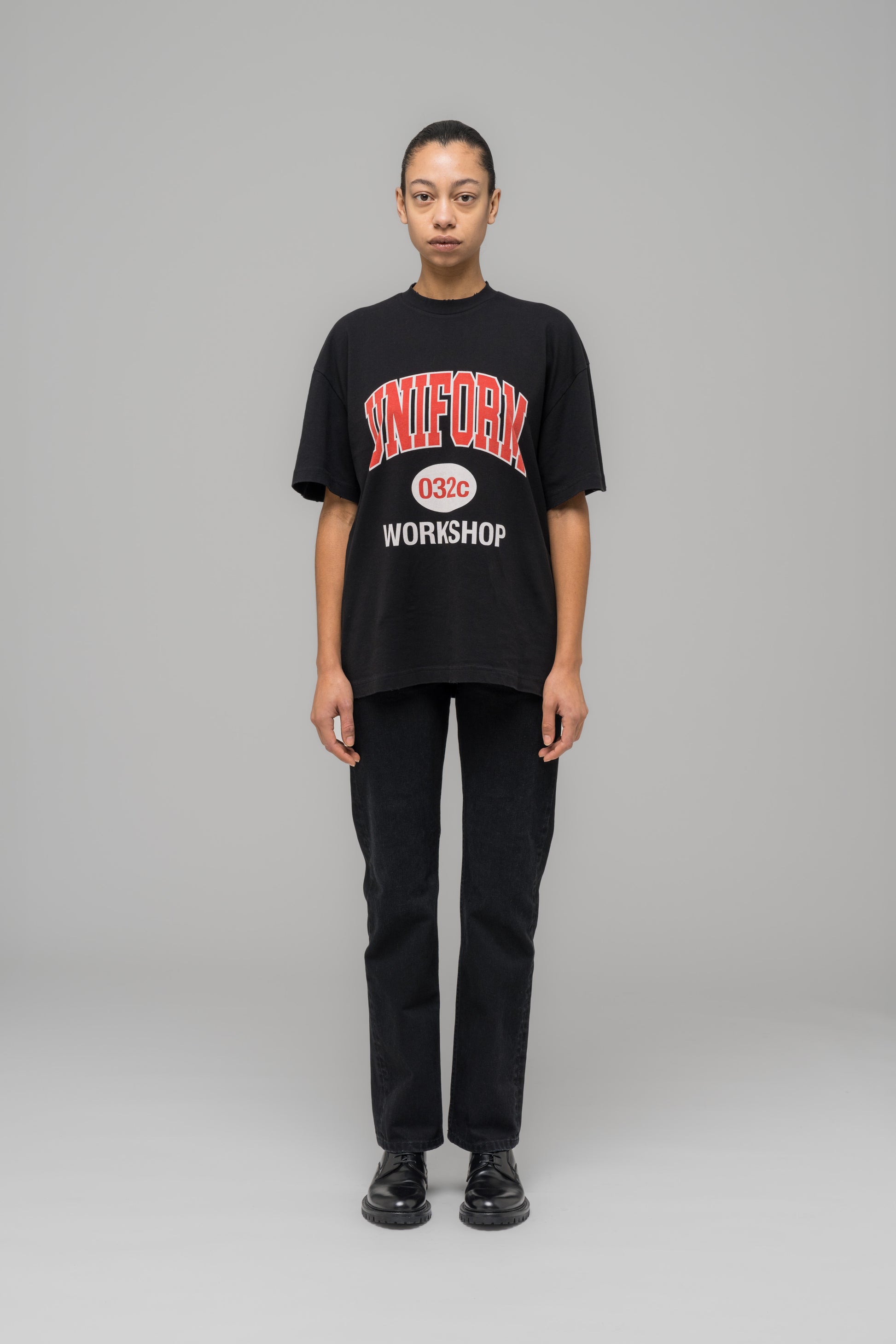 Regular-cut t-shirt in washed black with screen printed "LUCKY STRIKE" artwork on front and a tonal embroidered 032c logo at the back above hem. Heavily washed and lightly distressed for a vintage feel.