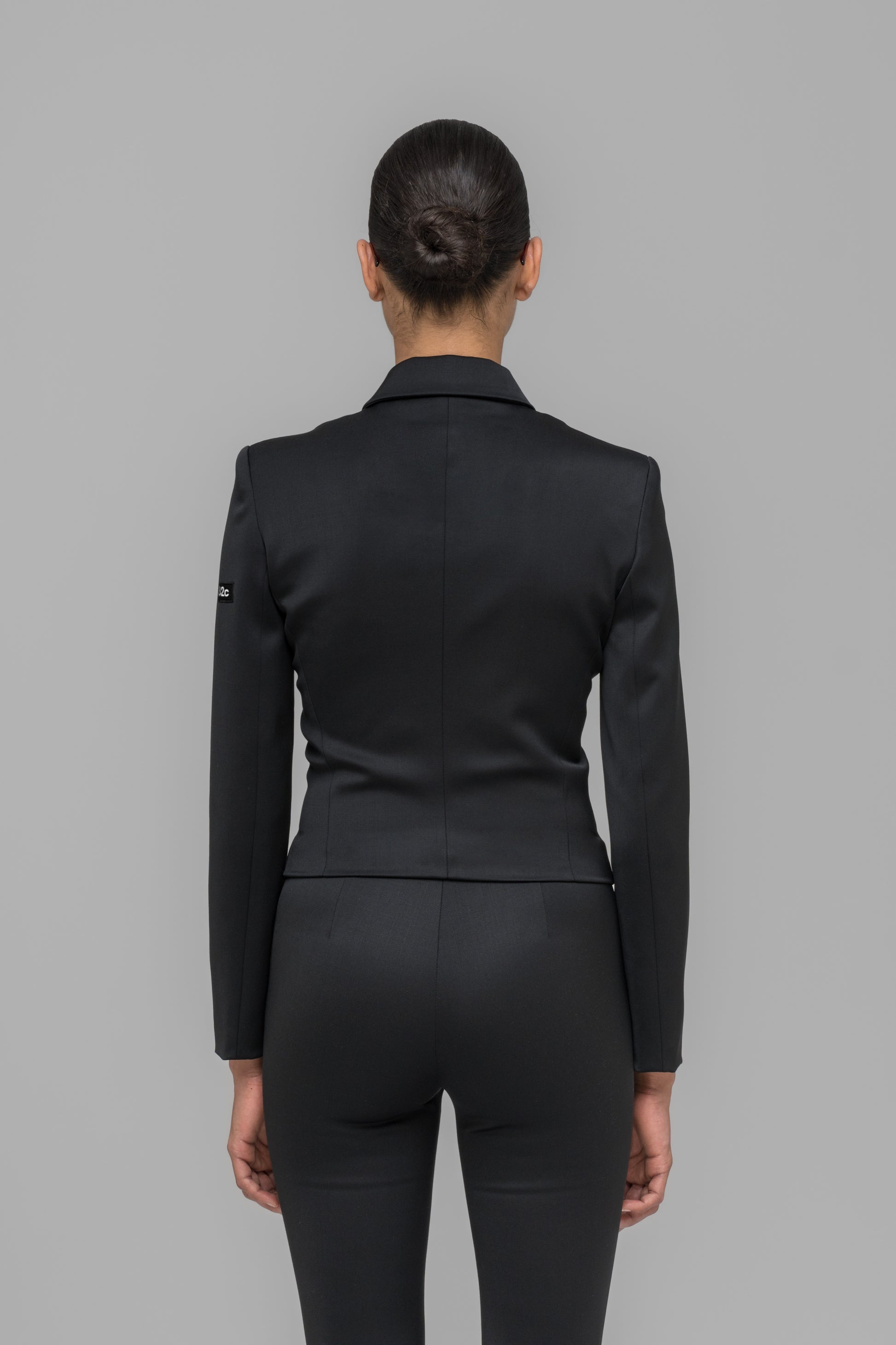 Tight-cut suit jacket made from Italian stretch suiting with a silky feel. Constructed with a classic suit collar and shrunken lapel. 032c embroidered patch on the sleeve and branded button front closure.